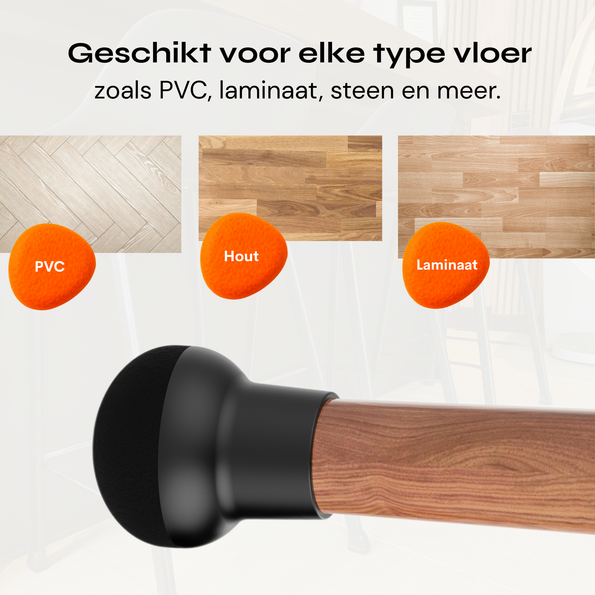 Mit meiner Hilfe können Sie Ihre Stühle bewegen, ohne dass sie Lärm machen und/oder Ihren Boden zerkratzen. Diese Variante ist für alle Bodenarten im Innenbereich geeignet.