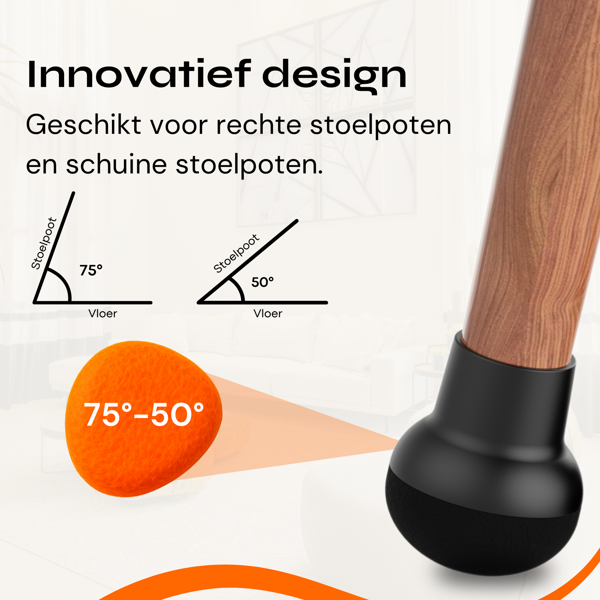 Die Pro Stuhlbeinkappe von FLOOQ® wird mit modernster Technologie hergestellt. Damit ist es die optimale Lösung für leicht schräge bis schiefe Stuhlbeine. Diese Stuhlbeinkappe ist für Stuhlbeine geeignet, die in einem Winkel von 75 ° bis 50 ° Grad relativ zum Boden. Wenn Sie auf der Suche nach einer wirkungsvollen Stuhlbeinkappe sind, die lange hält und gut passt, dann bin ich der Stuhlbeinschutz, den Sie brauchen.
