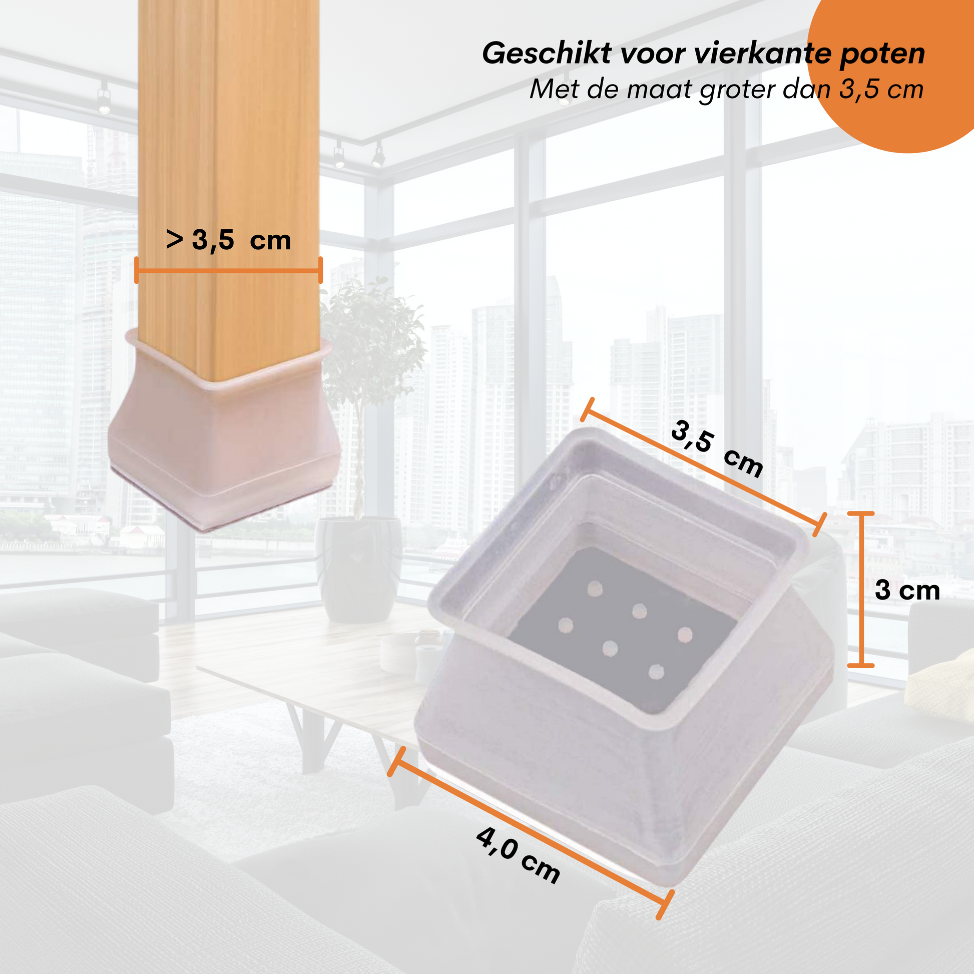 Geschikt voor alle vierkante stoelpoten en andere meubels.