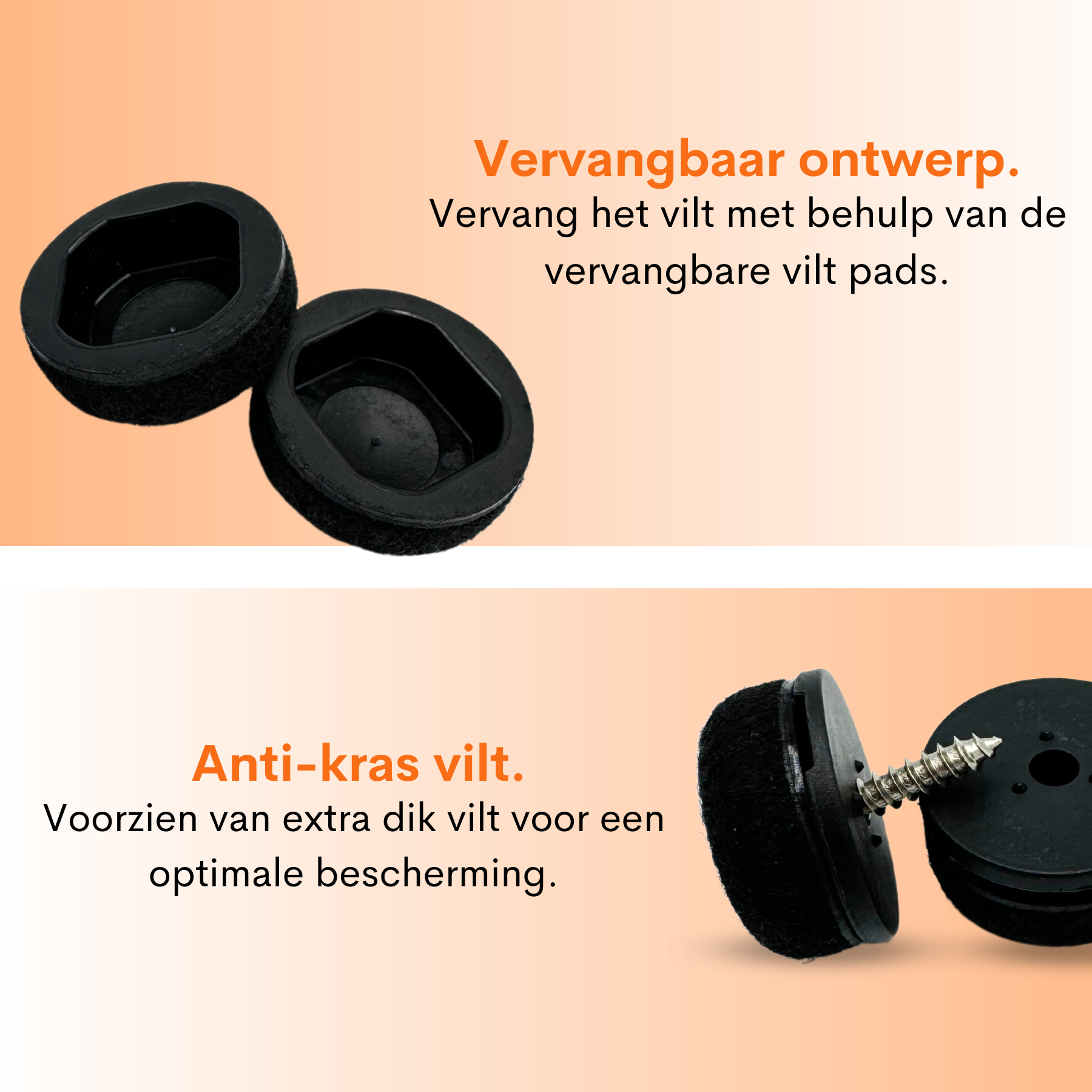Is het vilt van de eerste set versleten binnen? Geen probleem! Bestel eenvoudig een navulset viltcups en klik deze op het basisdeel die je maar één keer hoeft te plaatsen. De viltcups (zonder basisdeel) zijn direct te bestellen bij ons in een set van 12 of 24 stuks.