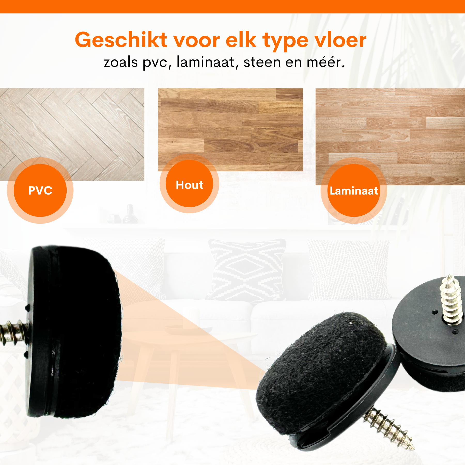 De Pro click-on stoelpootdoppen van FLOOQ® zijn gemaakt met de nieuwste technieken. Bent je nog niet bekend met de click-on variant van FLOOQ®? Dan is deze starterskit de juiste keuze. De vloerbeschermer is ontwerpen met een click-on systeem die het mogelijk maakt om vilt te vervangen. Klik het vilt los en vervang dit met een nieuwe vilt cup. Als u opzoek bent naar een effectieve stoelpootdop met een lange levensduur en die je eenvoudig kunt bevestigen, dan ben ik de stoelpootbescherming die u moet hebben. Deze variant is geschikt voor alle vormen stoelpoten en is beschikbaar in de maten 25mm en 35mm. Het product wordt geleverd in een complete set inclusief basisdeel zodat het product snel geplaatst kan worden.