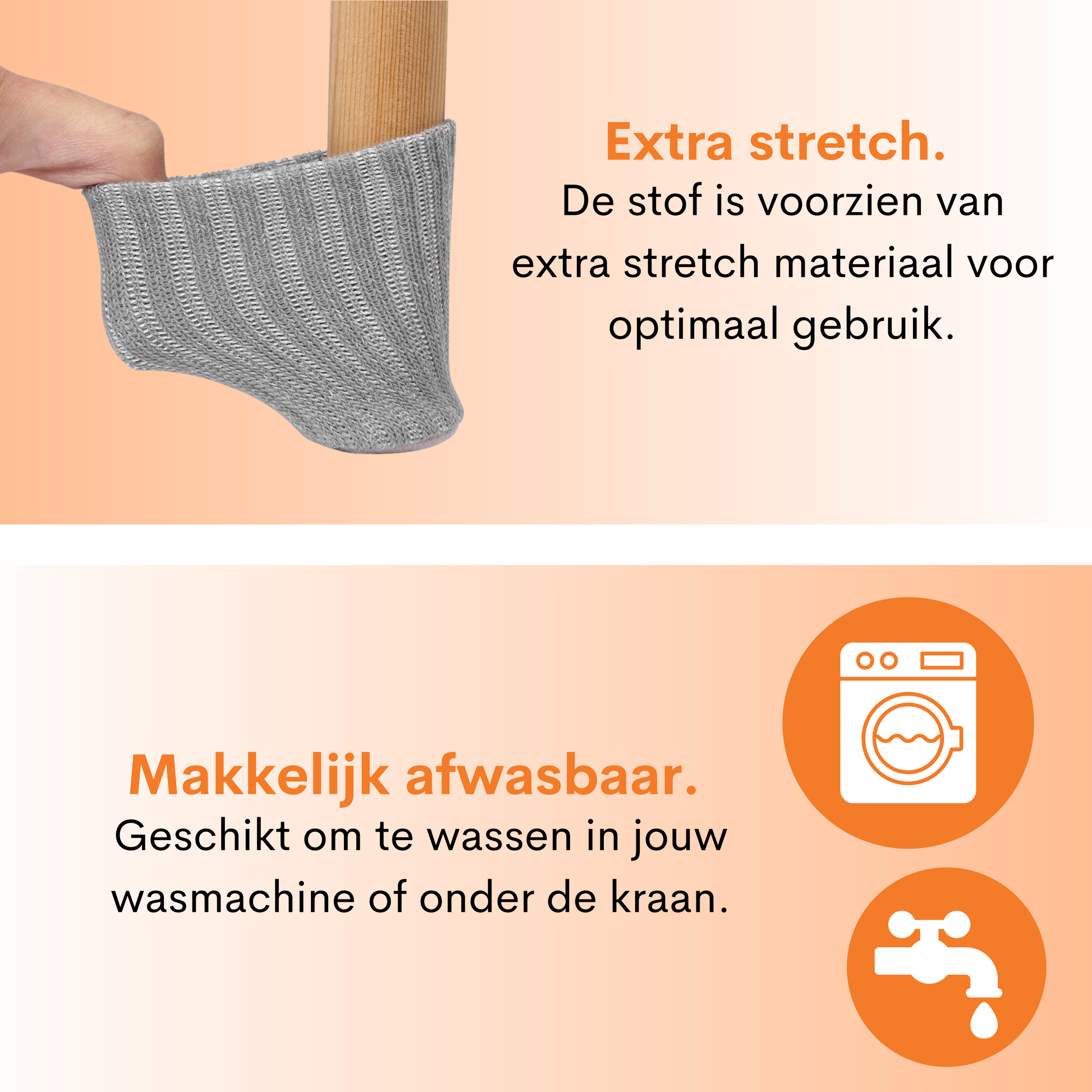 Wij zorgen ervoor dat er geen krassen meer kunnen ontstaan op alle soorten vloeren. Wij zijn uitgerust met beschermende onderkant die ervoor zorgt dat stoelpoten geen krassen meer kunnen maken. Eveneens zorgen wij ervoor dat het geluid van schuivende stoelen verleden tijd is. Wij zijn de ideale stoelpootsokken!
