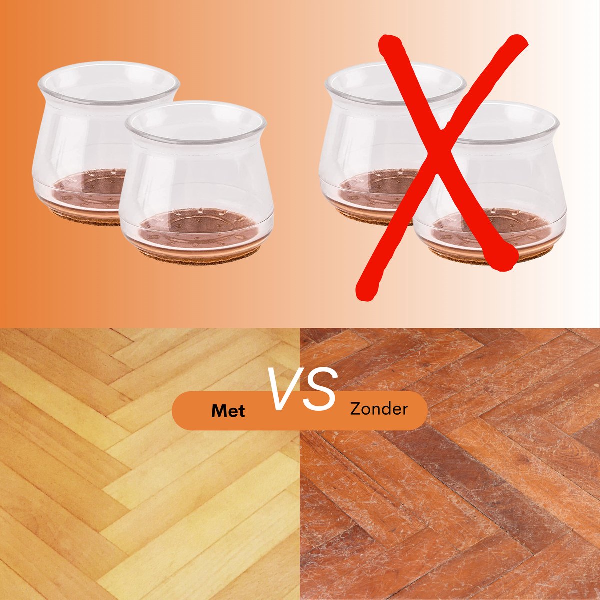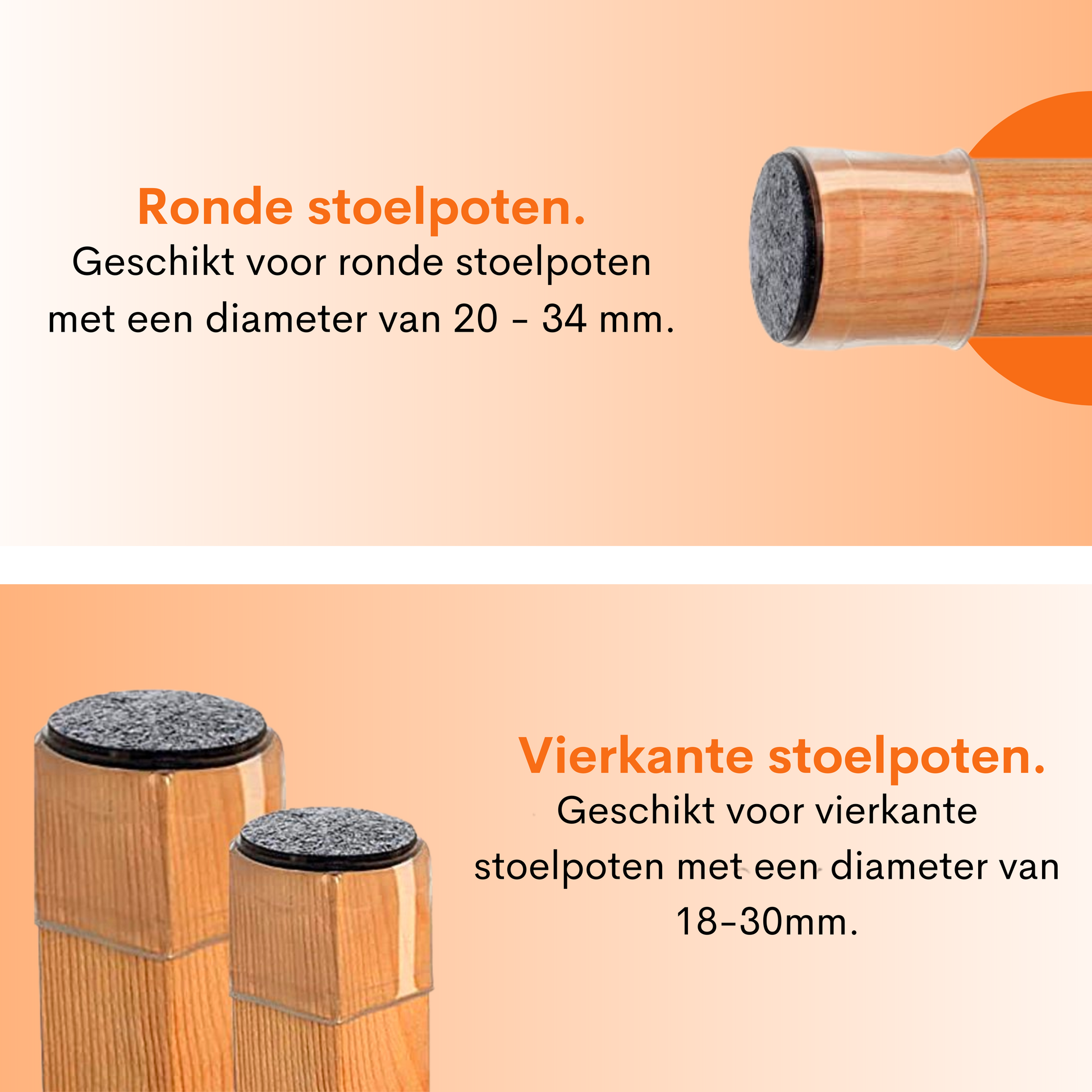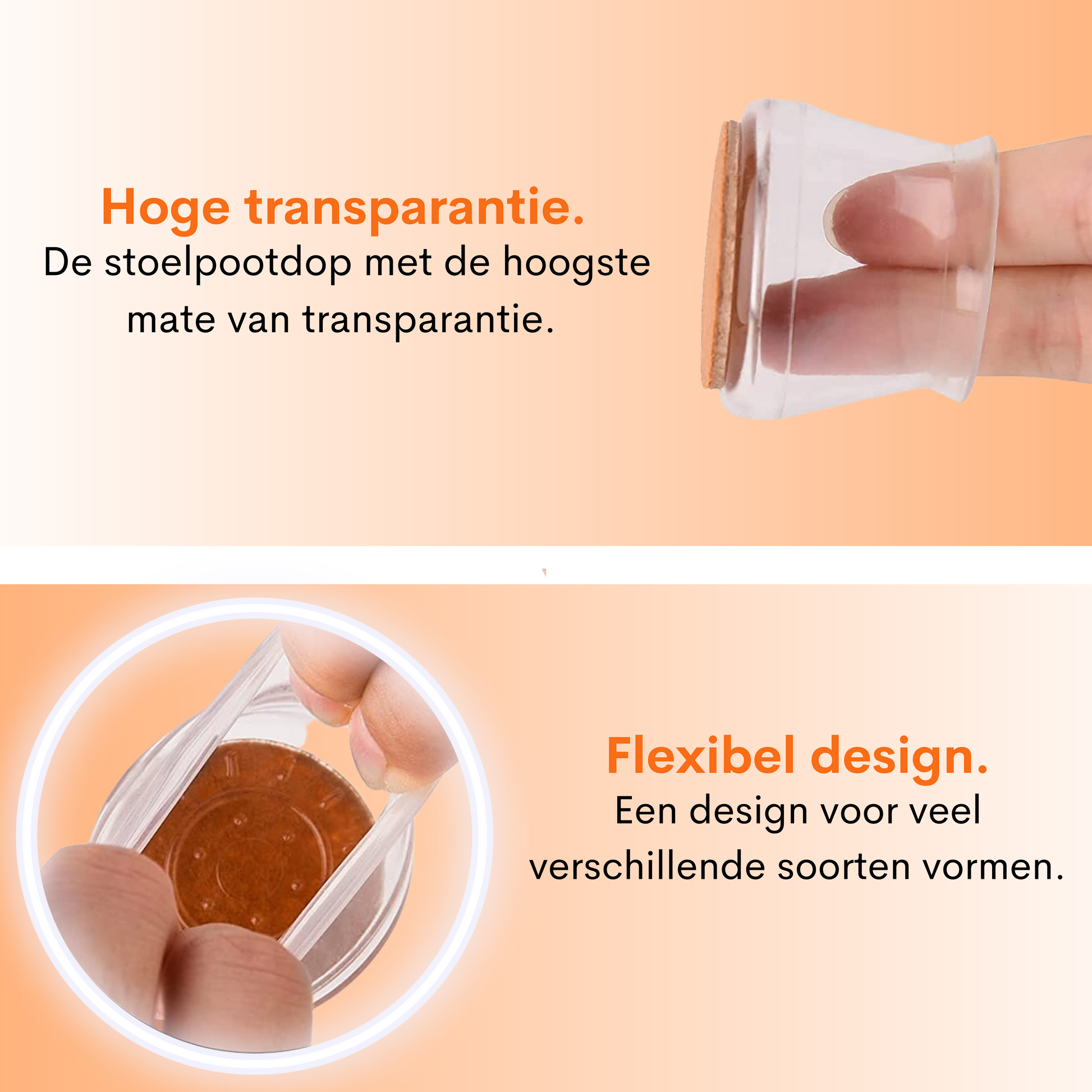 Heb je ook altijd last van vervelende krassen en luidruchtige stoelen of wil jij dit juist voorkomen? Dan zijn wij de oplossing voor jou! Wij zijn geschikt voor zowel ronde als vierkante stoelpootdoppen. Wij zijn gemaakt van extra sterke siliconen die ervoor zorgen dat wij klemvast aan jouw stoelen zullen vastzitten. Eveneens zijn wij flexibel waardoor ieder van ons makkelijk te bevestigen is. Ons nieuwe design is gemaakt van volledig transparant materiaal waardoor wij uniek zijn op de markt.