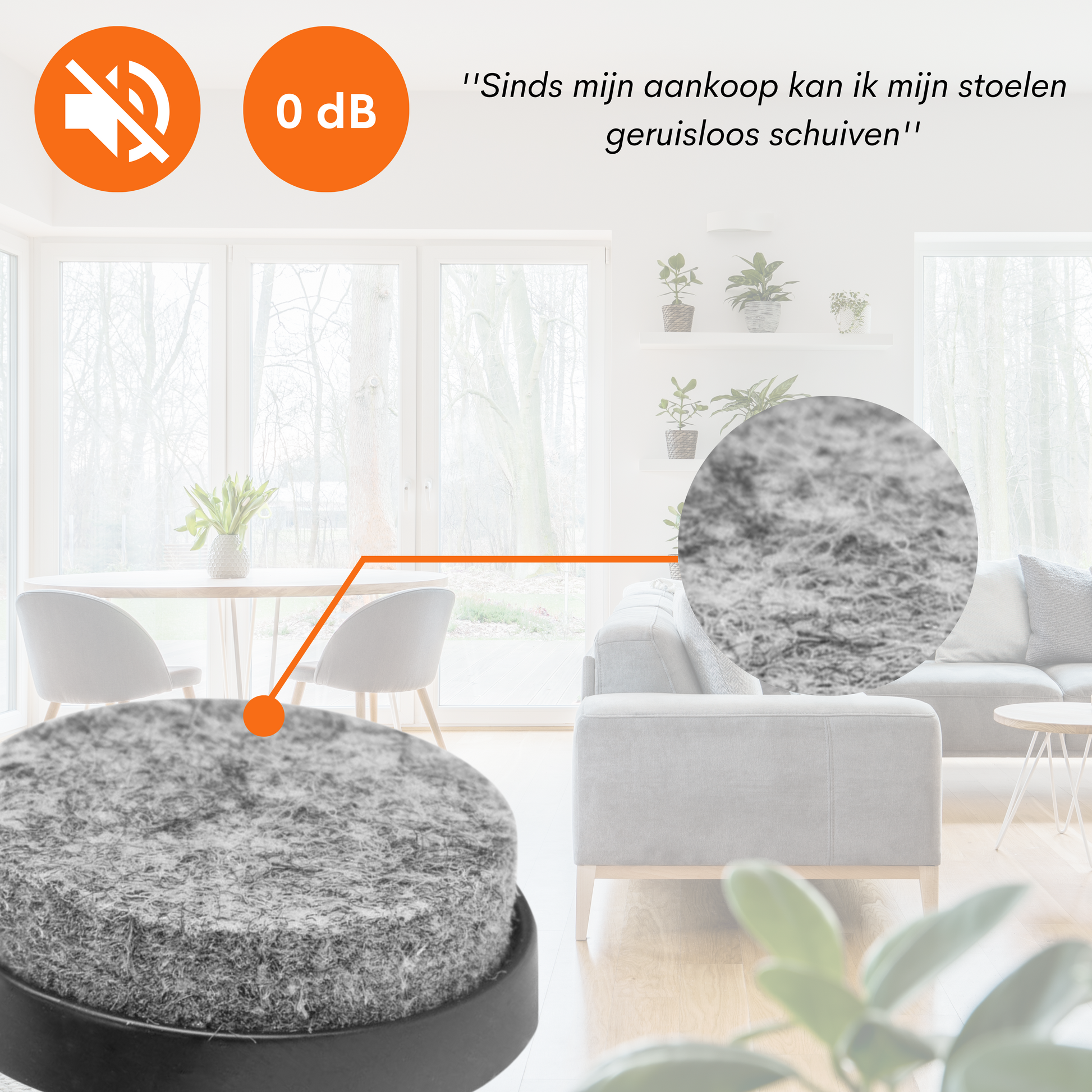 De viltglijder is ontworpen in de kleuren zwart met grijs vilt en valt nauwelijks op onder jouw stoelen. Daarnaast is er keuze uit een aantal maten waardoor deze geschikt is voor veel stoelpoten. Kies in de optiebalk de maat die het beste past bij uw stoelen.