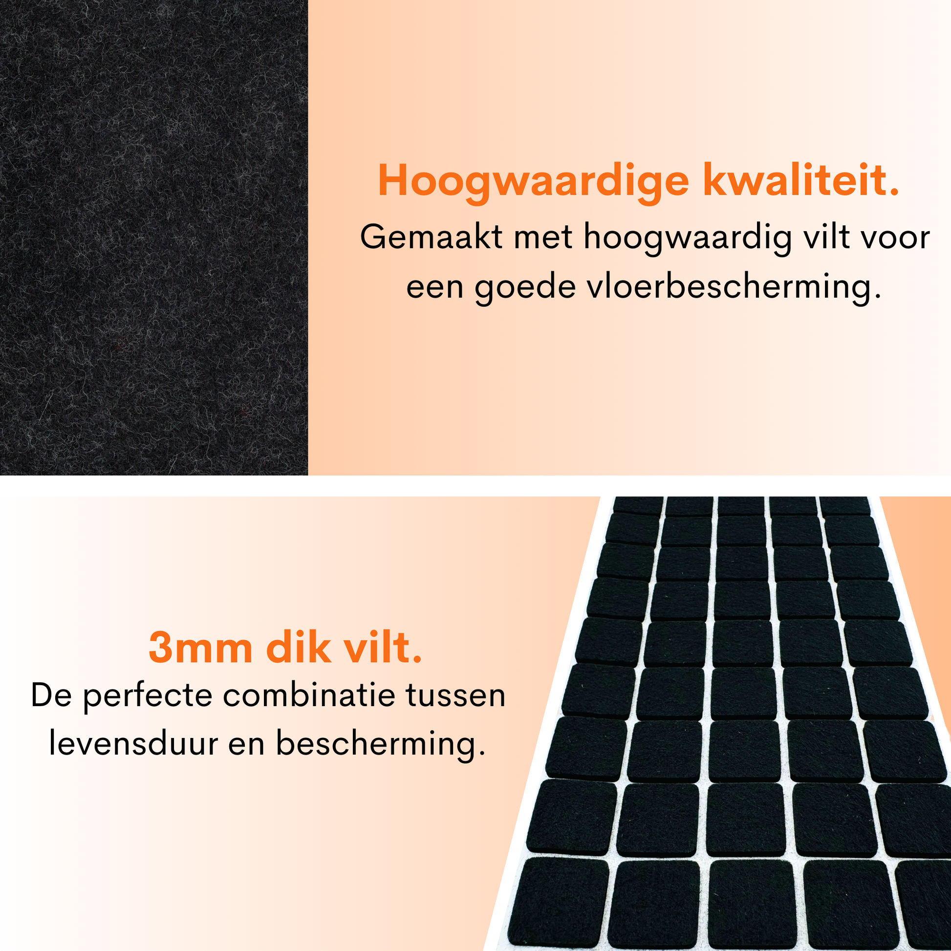 De viltjes zijn ontworpen met een extra sterke plakrand waardoor de levensduur langer is dan standaard viltjes. Deze varianten zijn geschikt voor alle vloertypen binnenshuis.