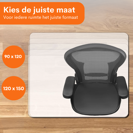 FLOOQ:s golvskydd finns i två storlekar, inklusive 90 x 120 cm och 120 x 150 cm. Välj den storlek som passar ditt utrymme.