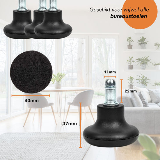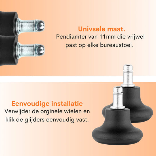 Har du också alltid problem med irriterande repor och högljudda stolar som ständigt rullar fram och tillbaka? Då är dessa kontorsstolsrullare den perfekta lösningen för dig. Med hjälp av rullarna förblir dina stolar på plats och repor undviks. Pendikterna på kontorsstolsrullarna är tillverkade i en universell pendiktsstorlek på 11 mm.
