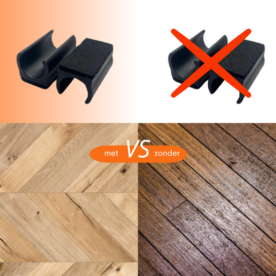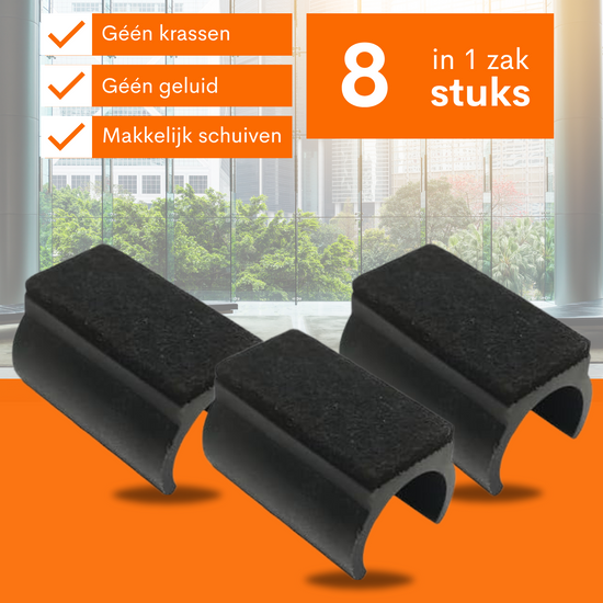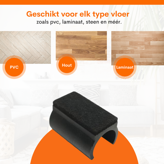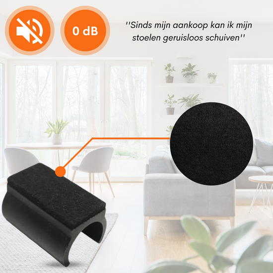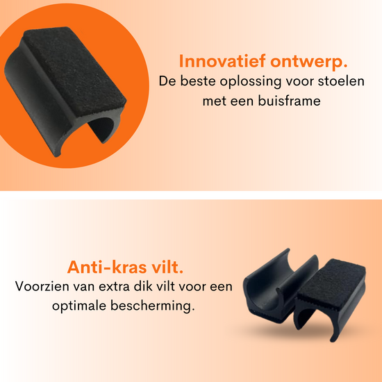 Wij zorgen ervoor dat er geen krassen meer kunnen ontstaan op alle soorten vloeren. Wij zijn uitgerust met een beschermende viltlaag die ervoor zorgt dat stoelpoten geen krassen meer kunnen maken. Eveneens zorgen wij ervoor dat het geluid van schuivende stoelen verleden tijd is door onze dempende laag.