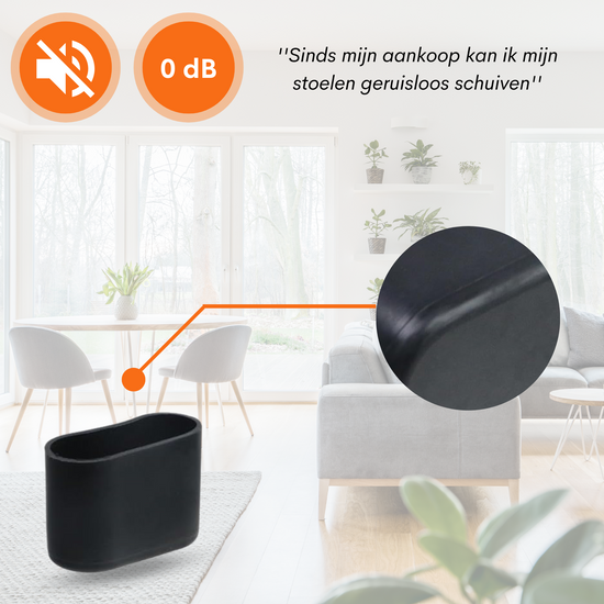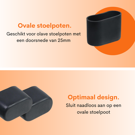 Ieder van ons is te gebruiken op vrijwel alle stoelen met een ovale poot. Wij zijn zo vormgegeven dat deze probleemloos aansluiten op ieder interieur en wij ons dus aanpassen aan jou. De zwarte kleur zorgt ervoor dat jouw stoelen hun stijlvolle look blijven behouden. Van een modern interieur tot aan een klassiek interieur, iedere interieurstijl past bij ons. Ook geschikt voor zowel rechte als licht schuin aflopende poten.
