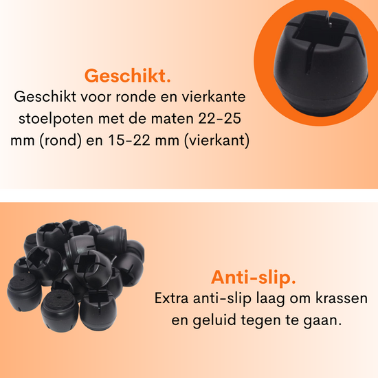Har du också alltid problem med irriterande repor och högljudda stolar eller vill du just undvika detta? Då är vi lösningen för dig! Vi passar för runda stolben med en diameter på 22 mm till 25 mm och fyrkantiga stolben med en diameter på 15-22 mm. Vi är tillverkade av extra stark silikon som gör att vi sitter fast ordentligt på dina stolar. Vi är också flexibla vilket gör att var och en av oss är lätt att fästa. Vår design är utformad på ett sådant sätt att vi passar utmärkt på varje stoldesign.