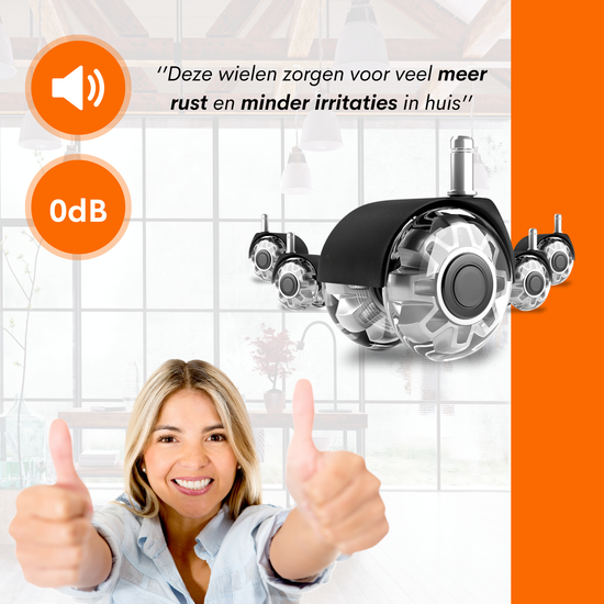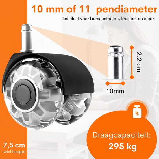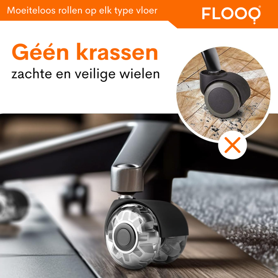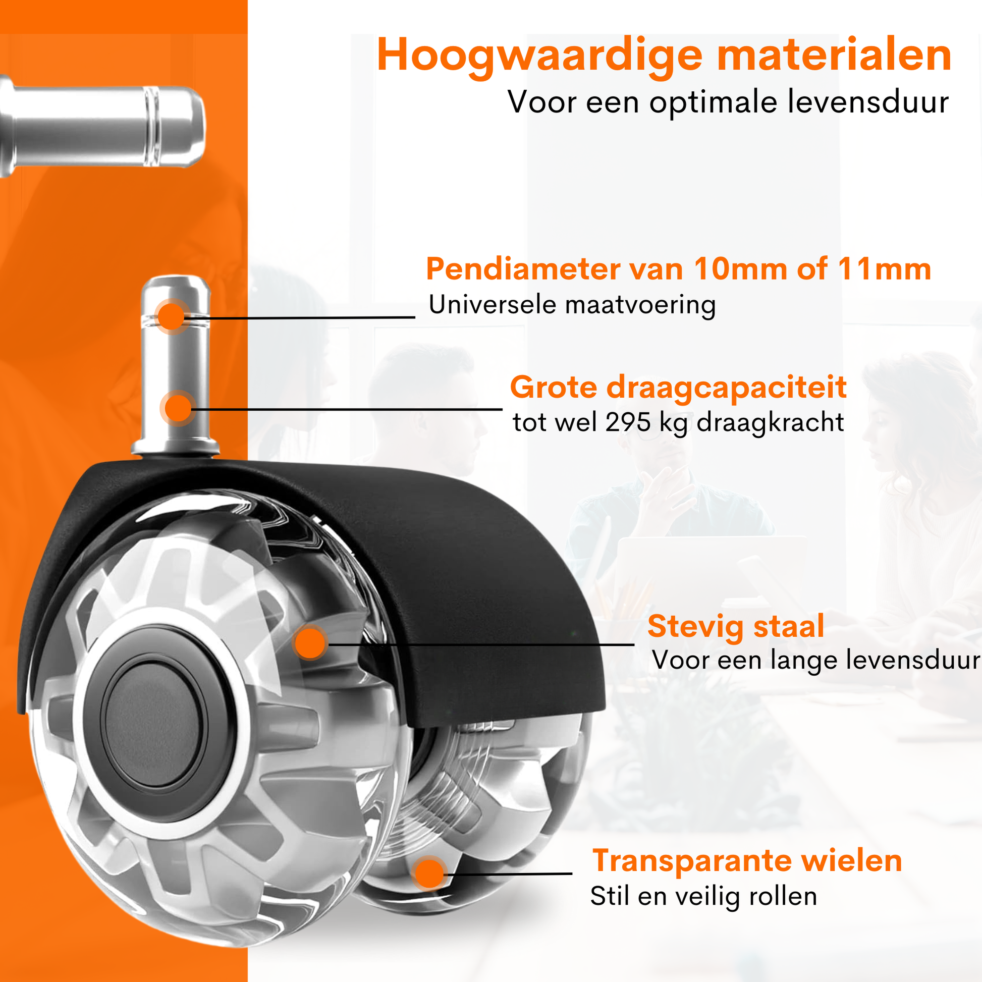 Onze wielen zijn ontworpen met aandacht voor de vloer en voorkomen krassen en beschadigingen, waardoor je vloer er langer als nieuw uitziet, of het nu gaat om hardhout, tegels of tapijt.Sterk en duurzaam, deze wielen zijn gebouwd om lang mee te gaan en kunnen tot 295 kg dragen, wat ze perfect maakt voor een breed scala aan gebruikers en toepassingen. Dus of je nu veel tijd achter je bureau doorbrengt of af en toe zit, deze wielen zijn er om je te ondersteunen.